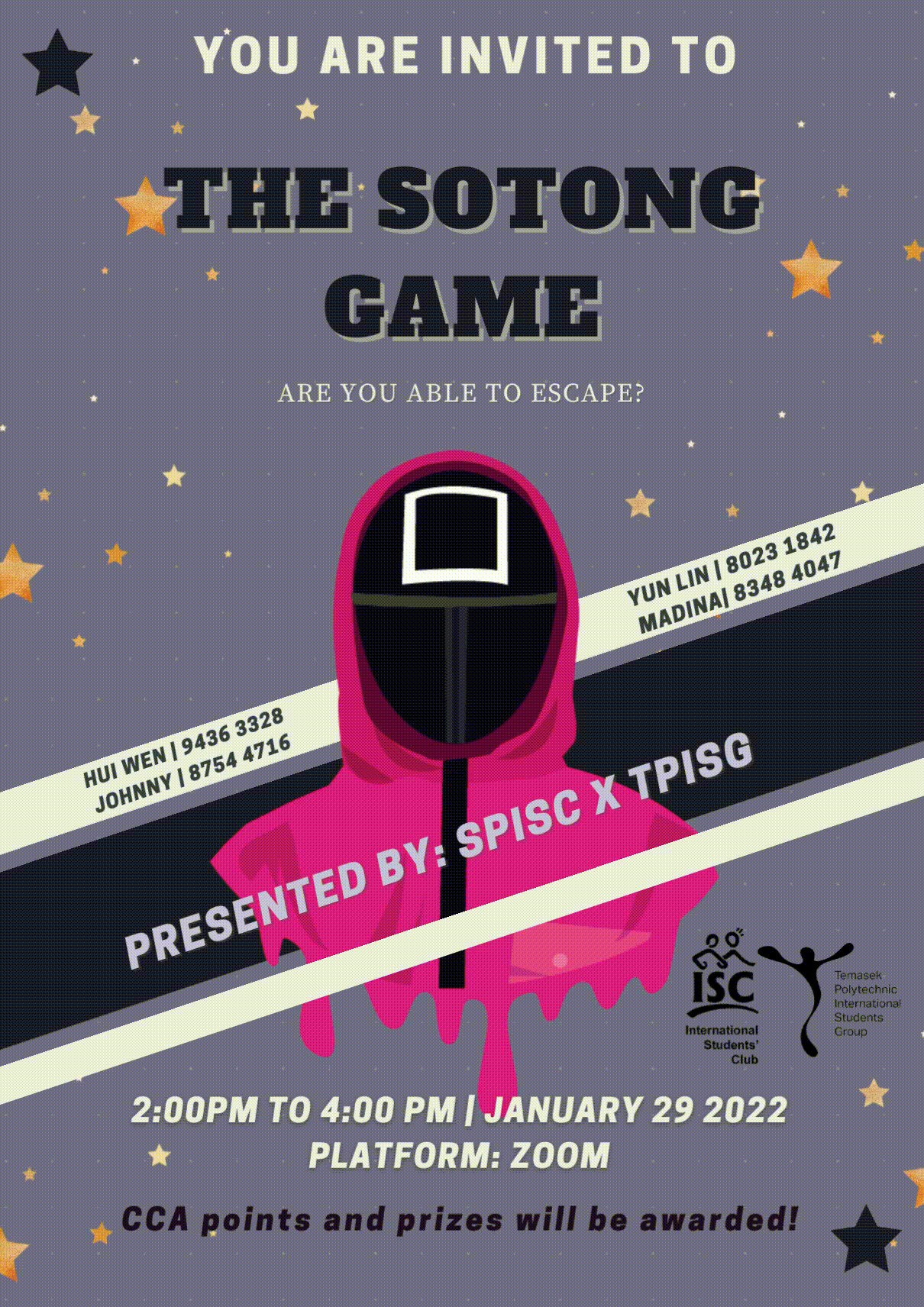 The Sotong Games , an event with a Squid Game theme, was a resounding success! Held on the 29th of January 2022, it was an online collaboration event with Temasek Polytechnic International Students' Group that saw enthusiastic participants from both schools come together to experience an online version of the Squid Game Event.